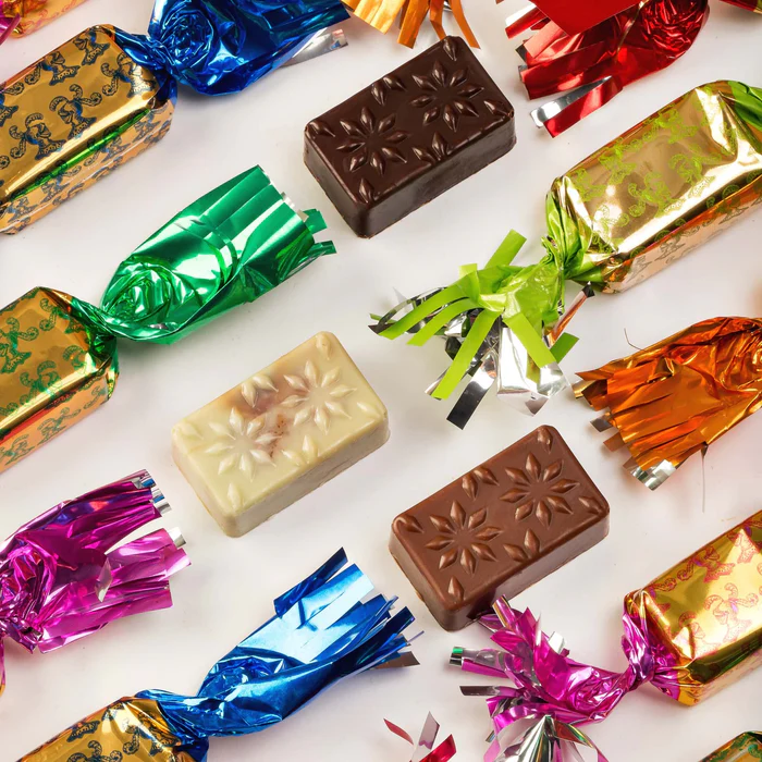 Les papillotes : du bon praliné recouvert de notre couverture de chocolat et les traditionnelles blagues à découvrir à l’intérieur.